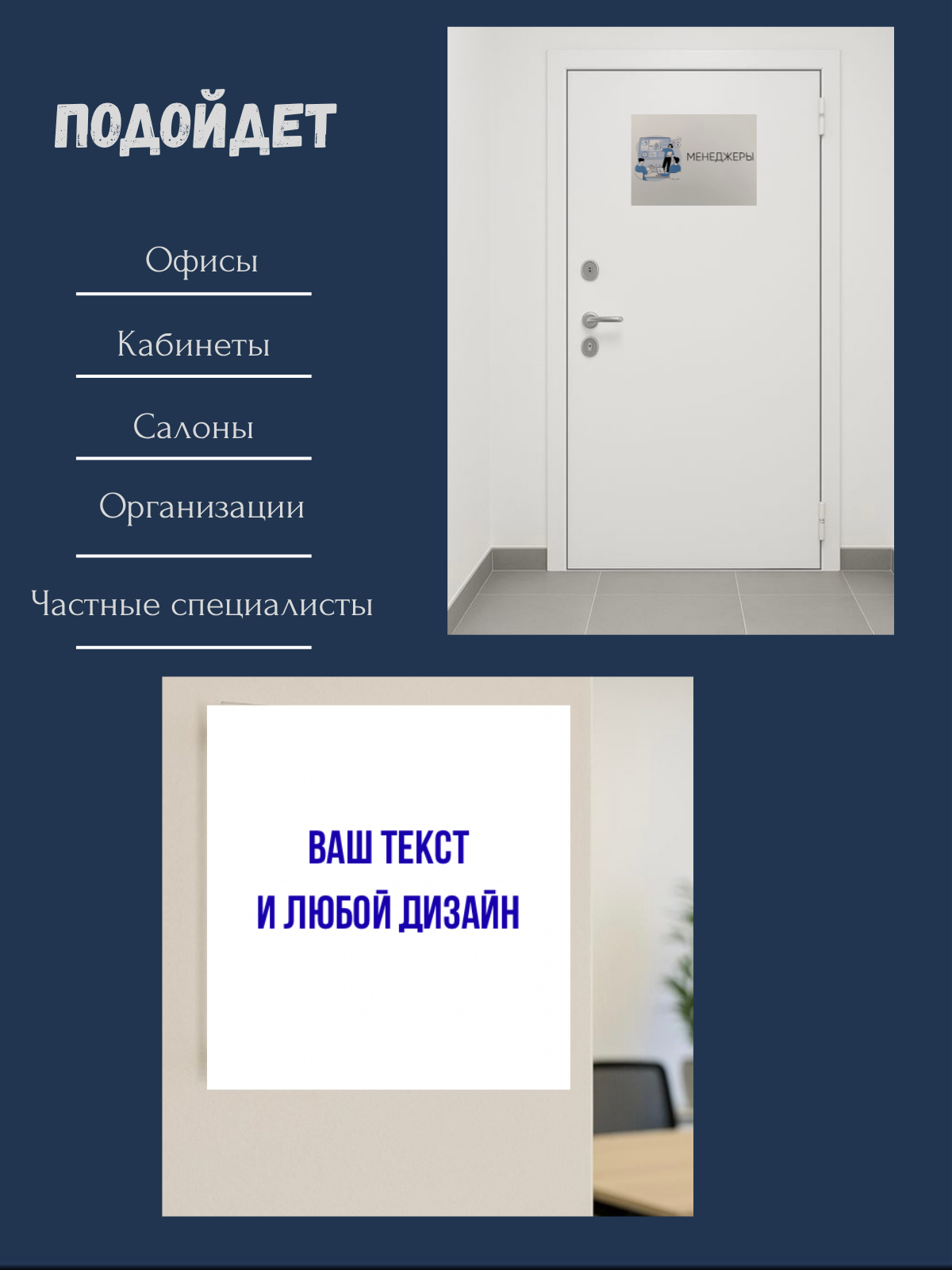 Что можно заказать: • Таблички на дверь • Кабинетные таблички • Навигационные указатели • Режим работы • Таблички с логотипом компании • Информационные вывески • Номерки и обозначения помещений • Любые персональные макеты